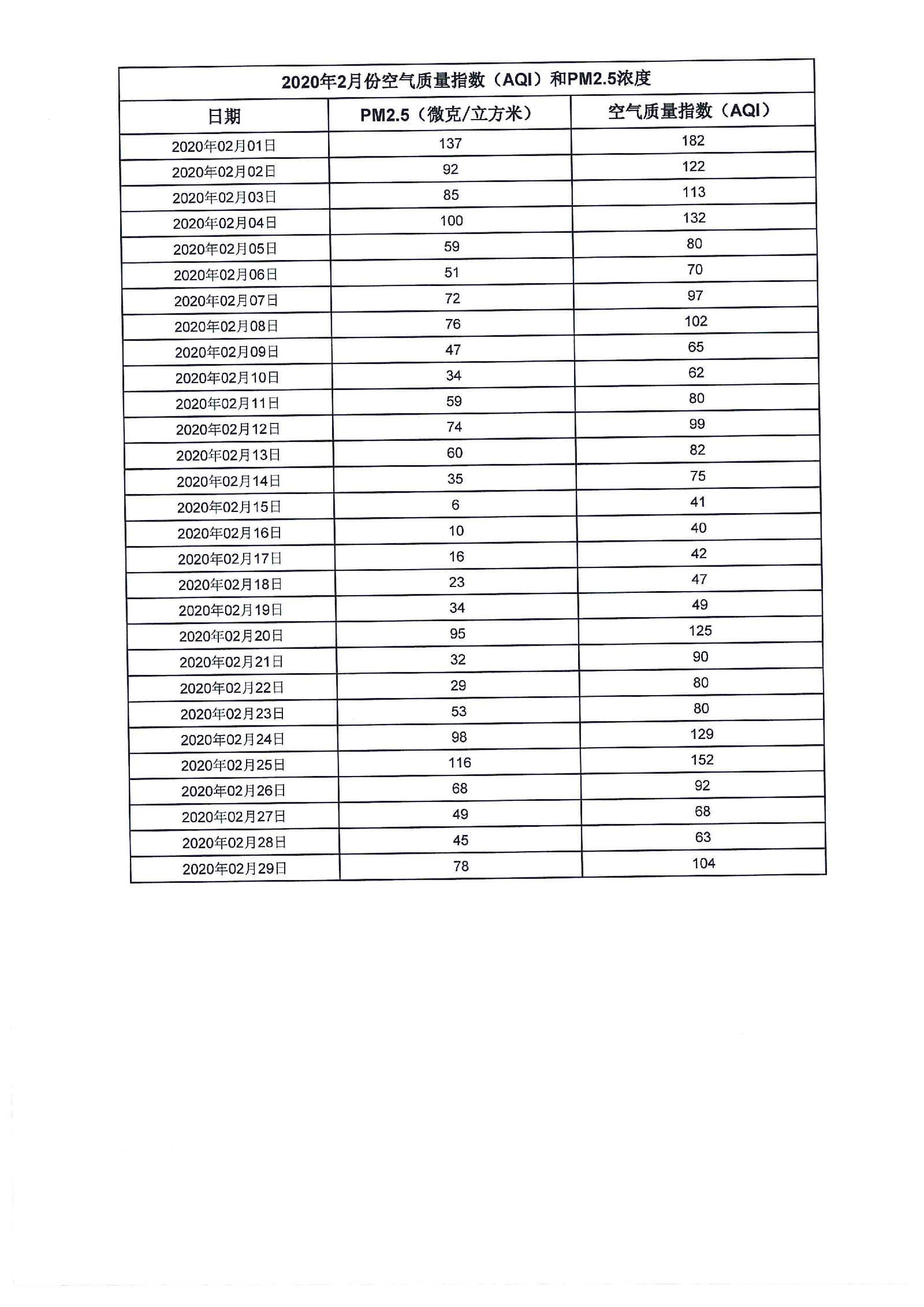 2020年2月份空气质量指数(AQI)和PM2.5浓度