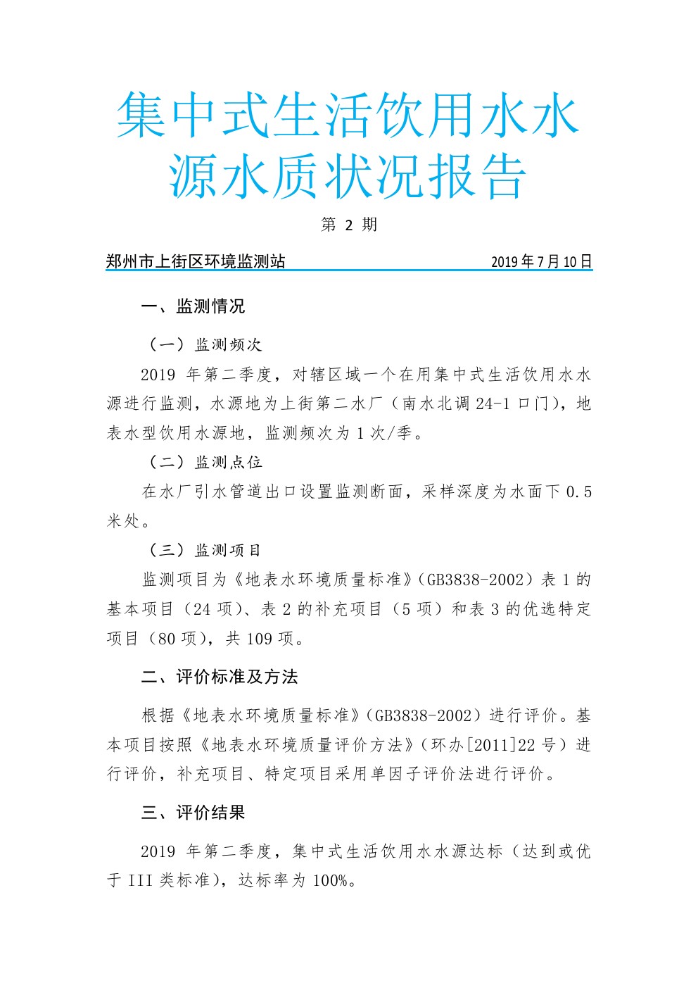 2019年第二季度集中式生活饮用水水源水质状况报告