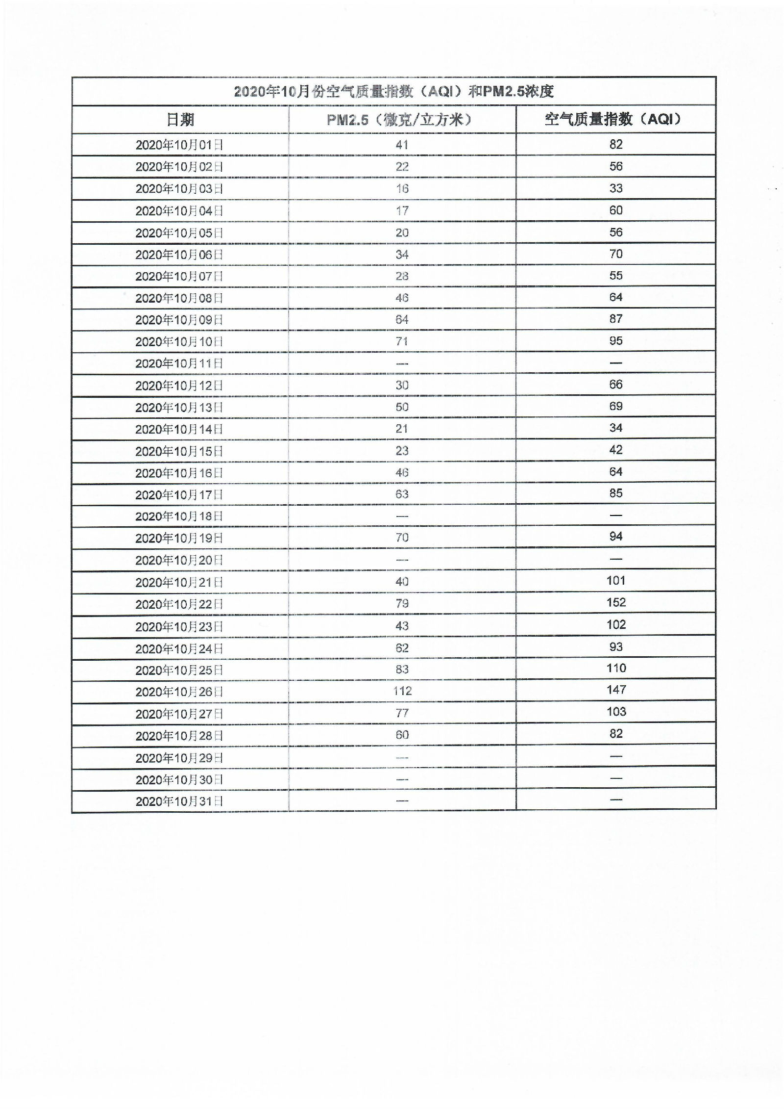 2020年10月份空气质量指数(AQI)和PM2.5浓度