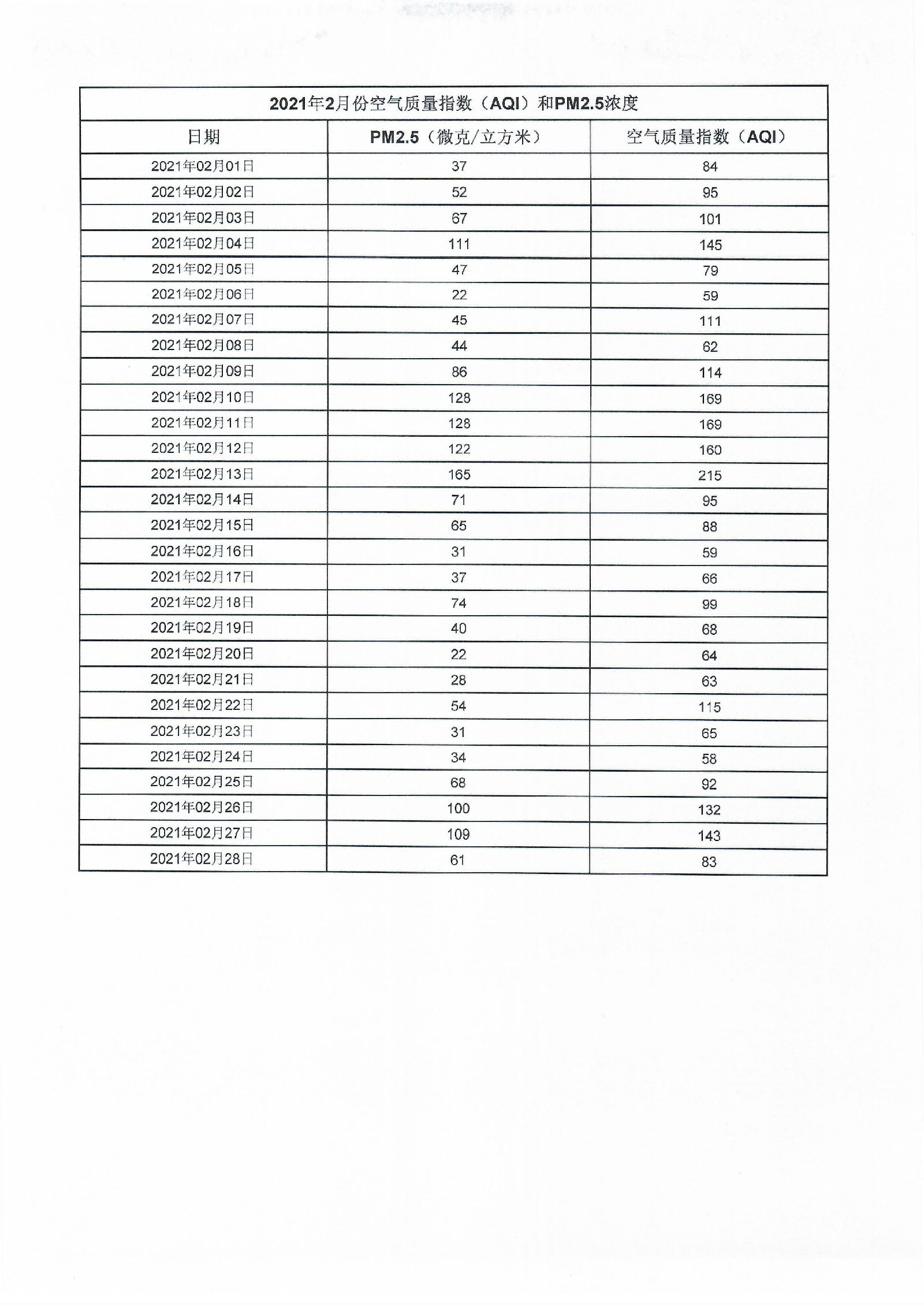 2021年2月份空气质量指数(AQI)和PM2.5浓度