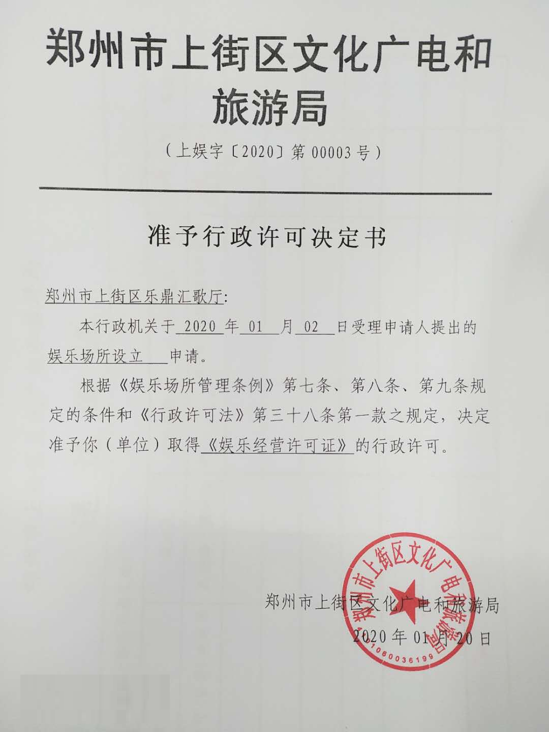 郑州上街区乐鼎汇歌厅《准予行政许可决定书》