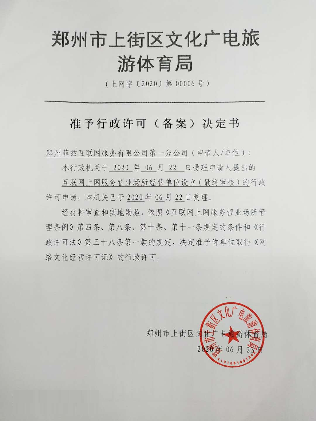 郑州菲兹互联网服务有限公司第一分公司《准予行政许可(备案)决定书》