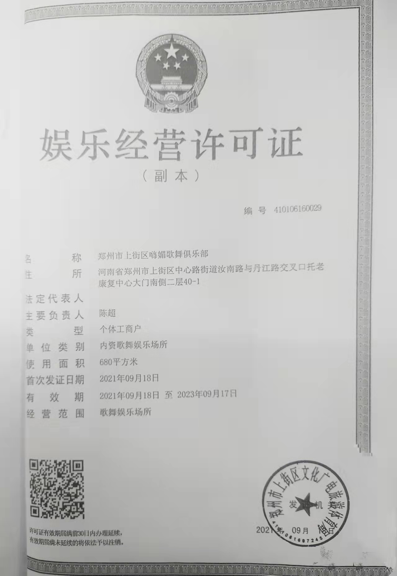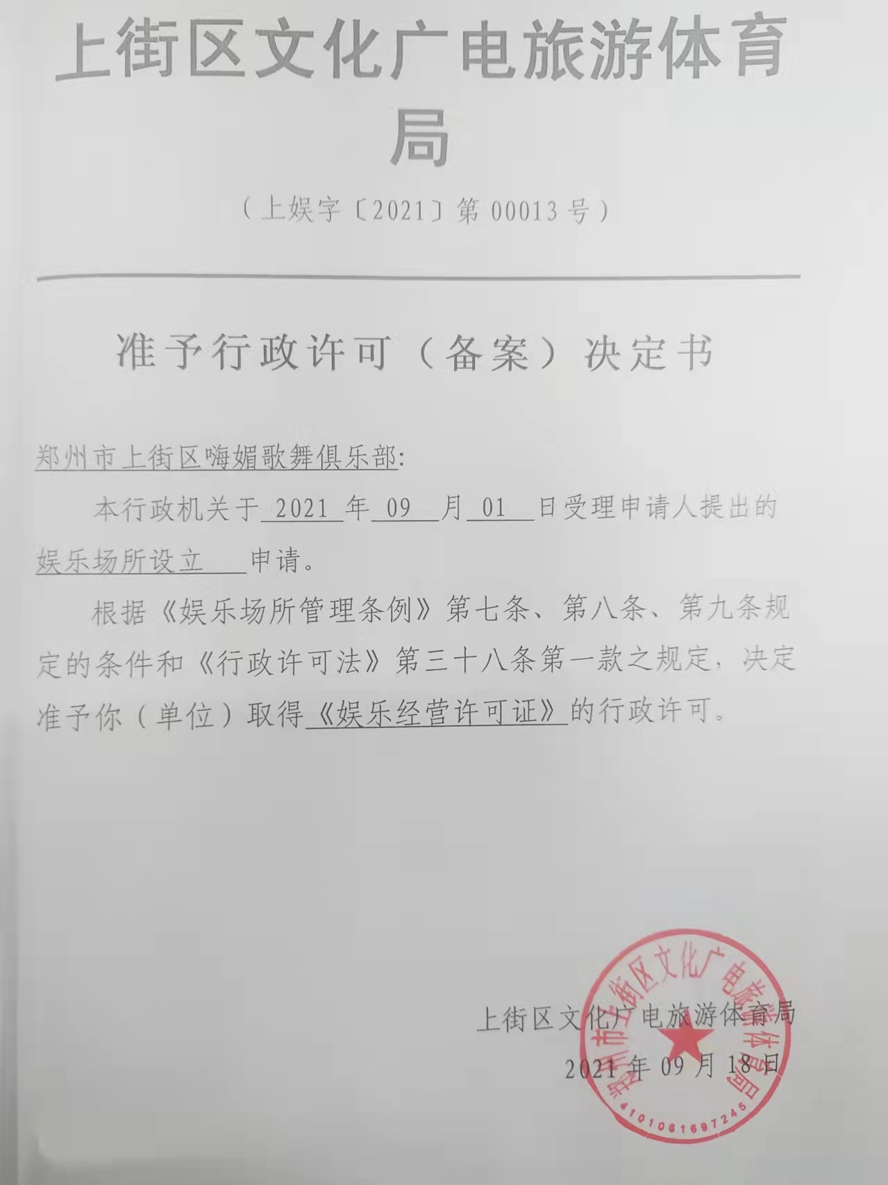 郑州市上街区嗨媚歌舞俱乐部《准予行政许可决定书》