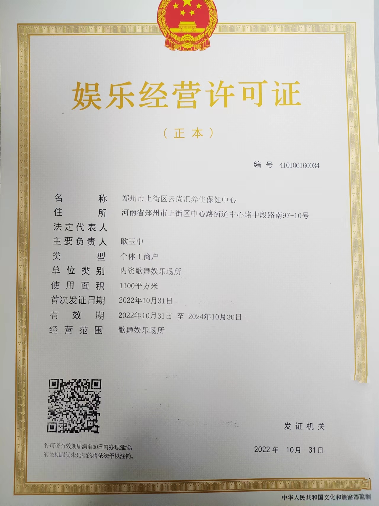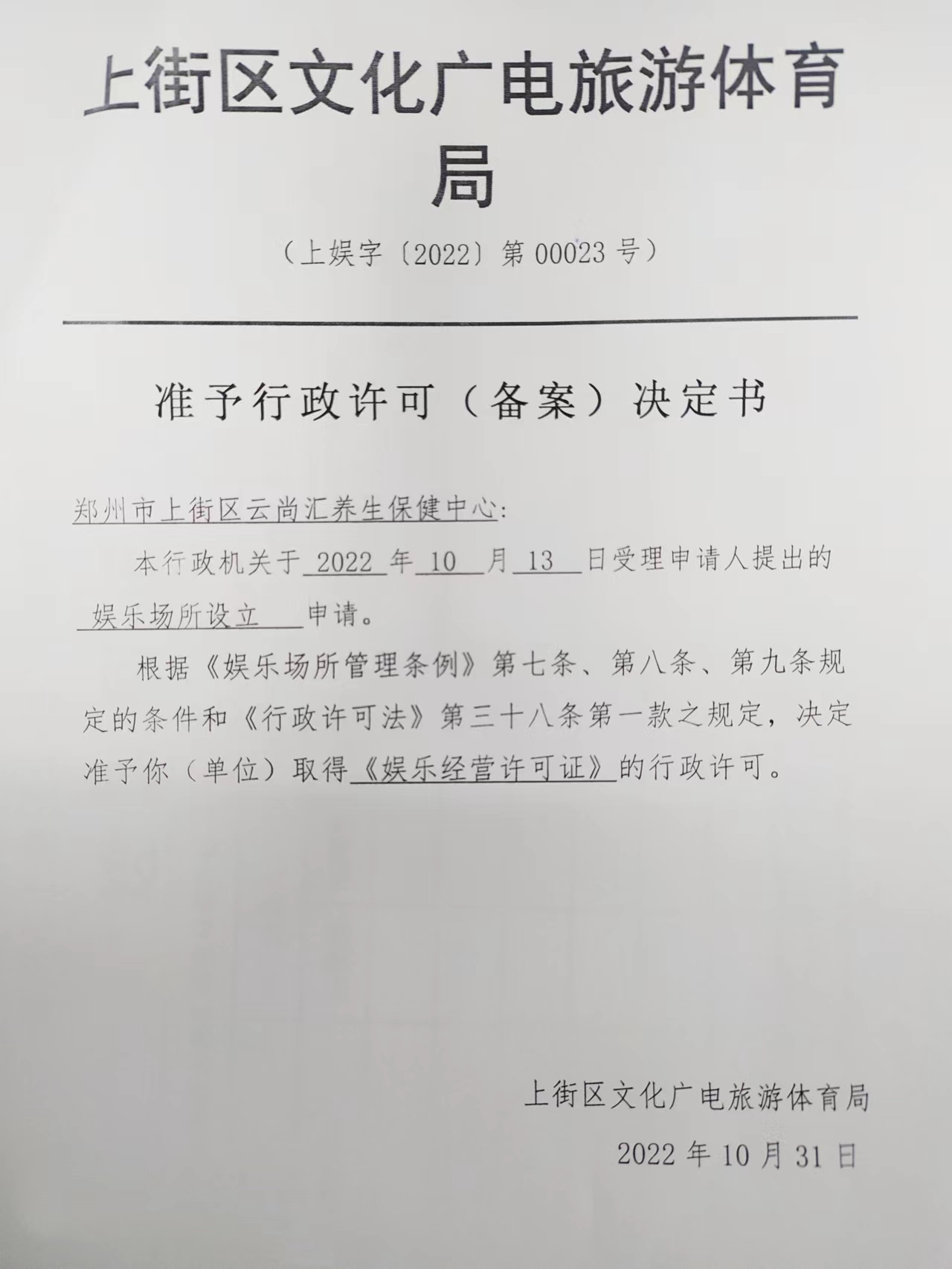 郑州市上街区云尚汇养生保健中心《准予行政许可决定书》