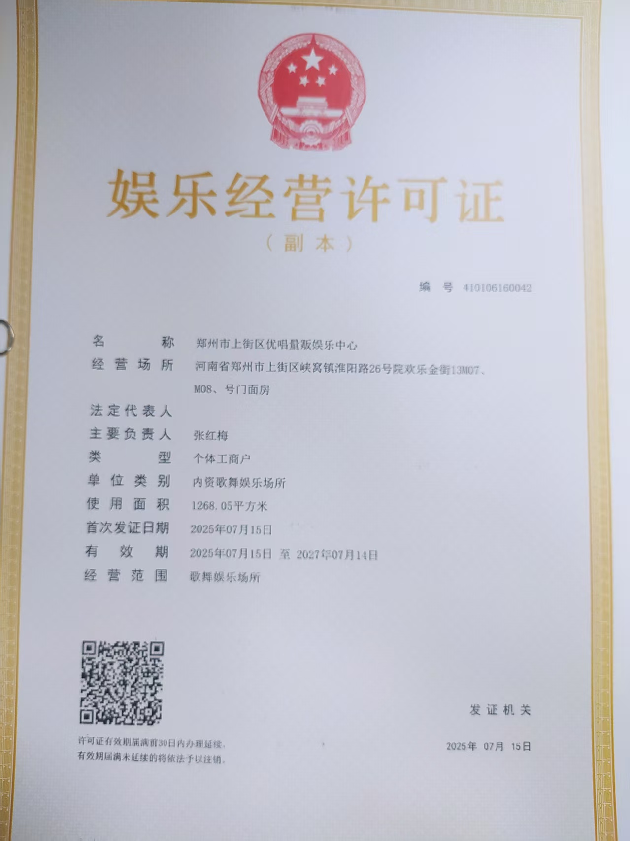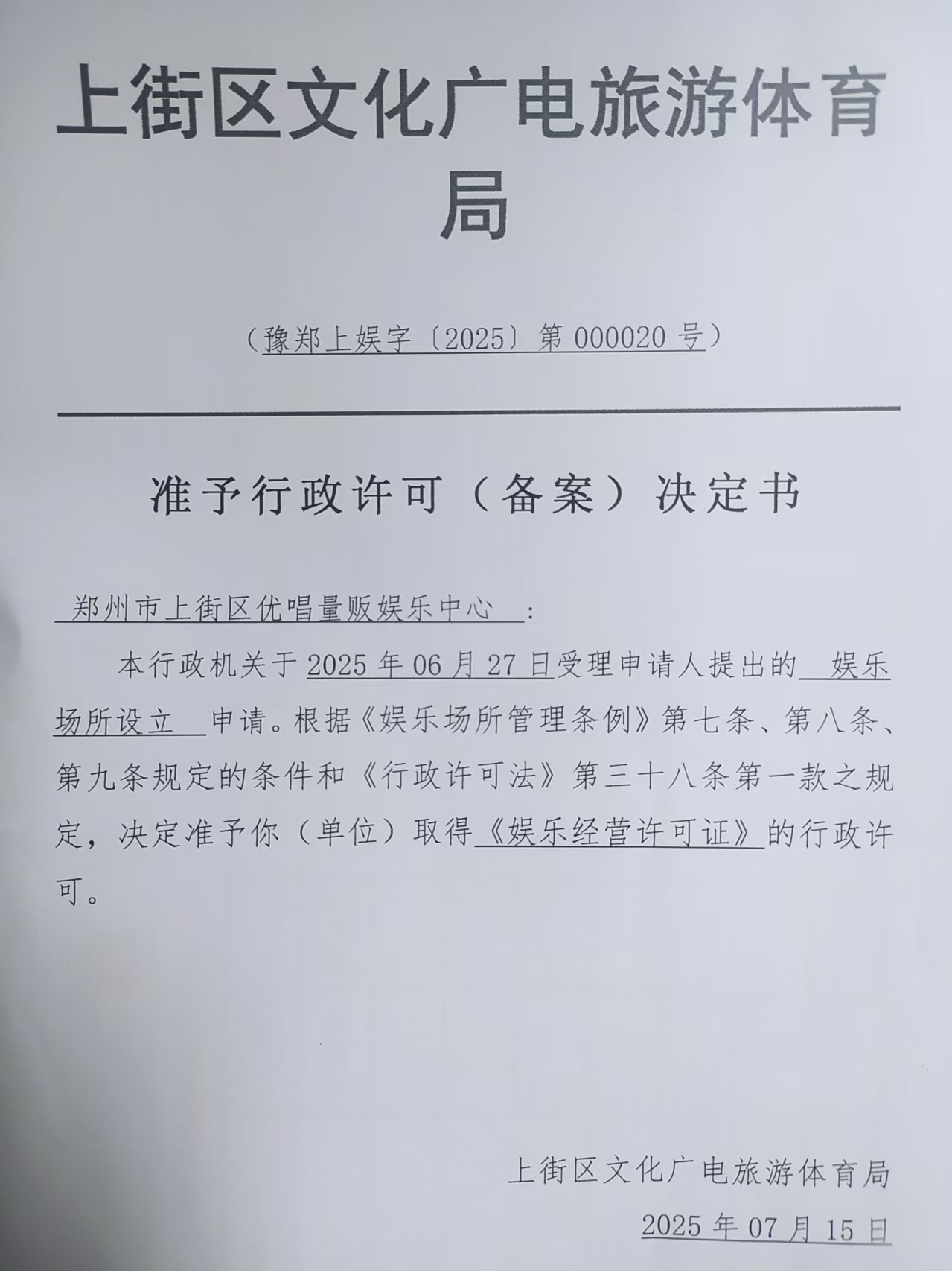 郑州市上街区优唱量贩娱乐中心《准予行政许可决定书》统一社会信用代码:92410106MAEKMBXA2D