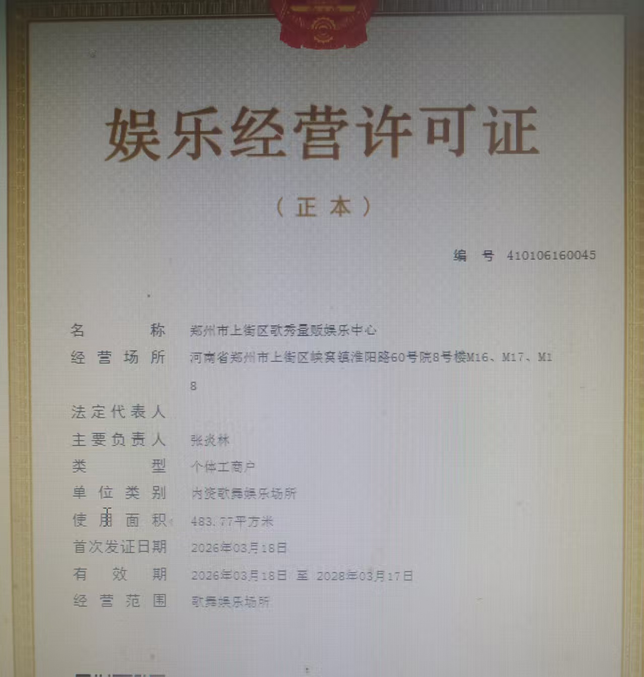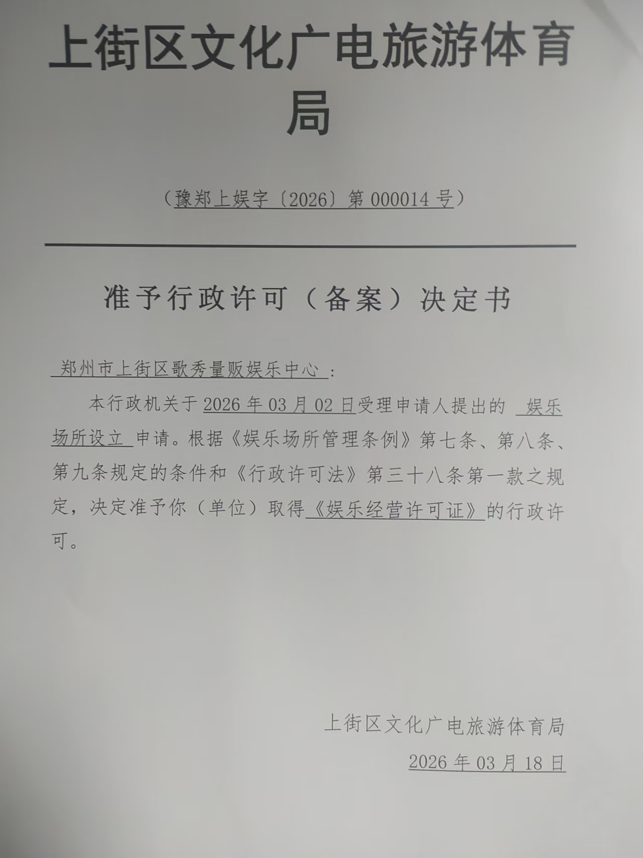 郑州市上街区歌秀量贩娱乐中心《准予行政许可决定书》