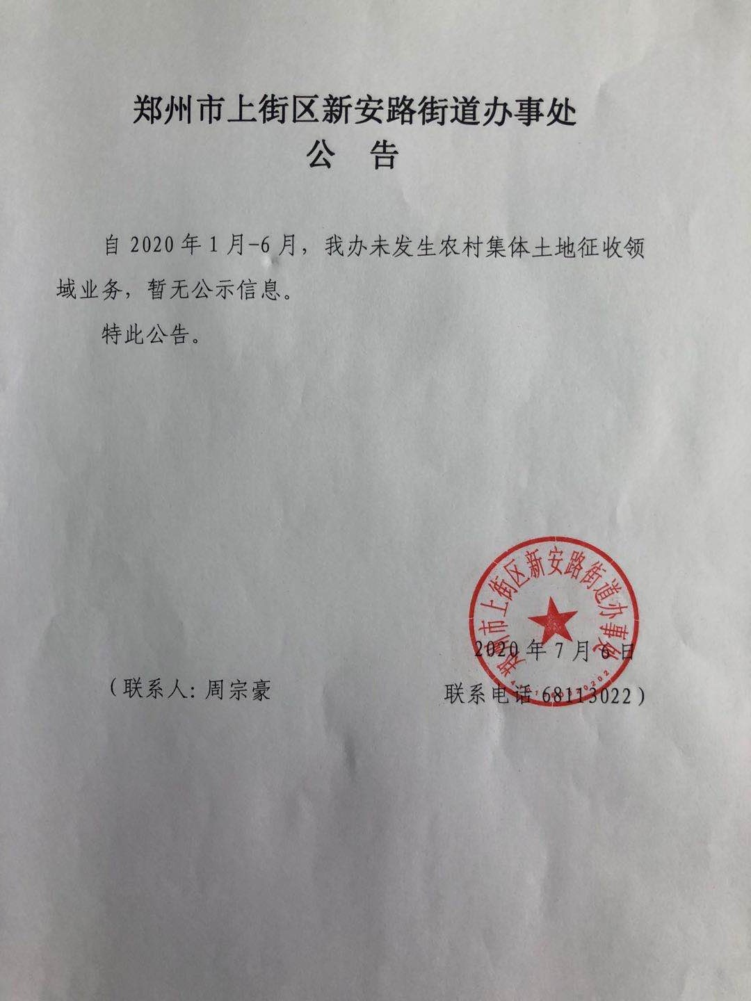 上街区新安路街道办事处2020年上半年度关于征收土地的公告